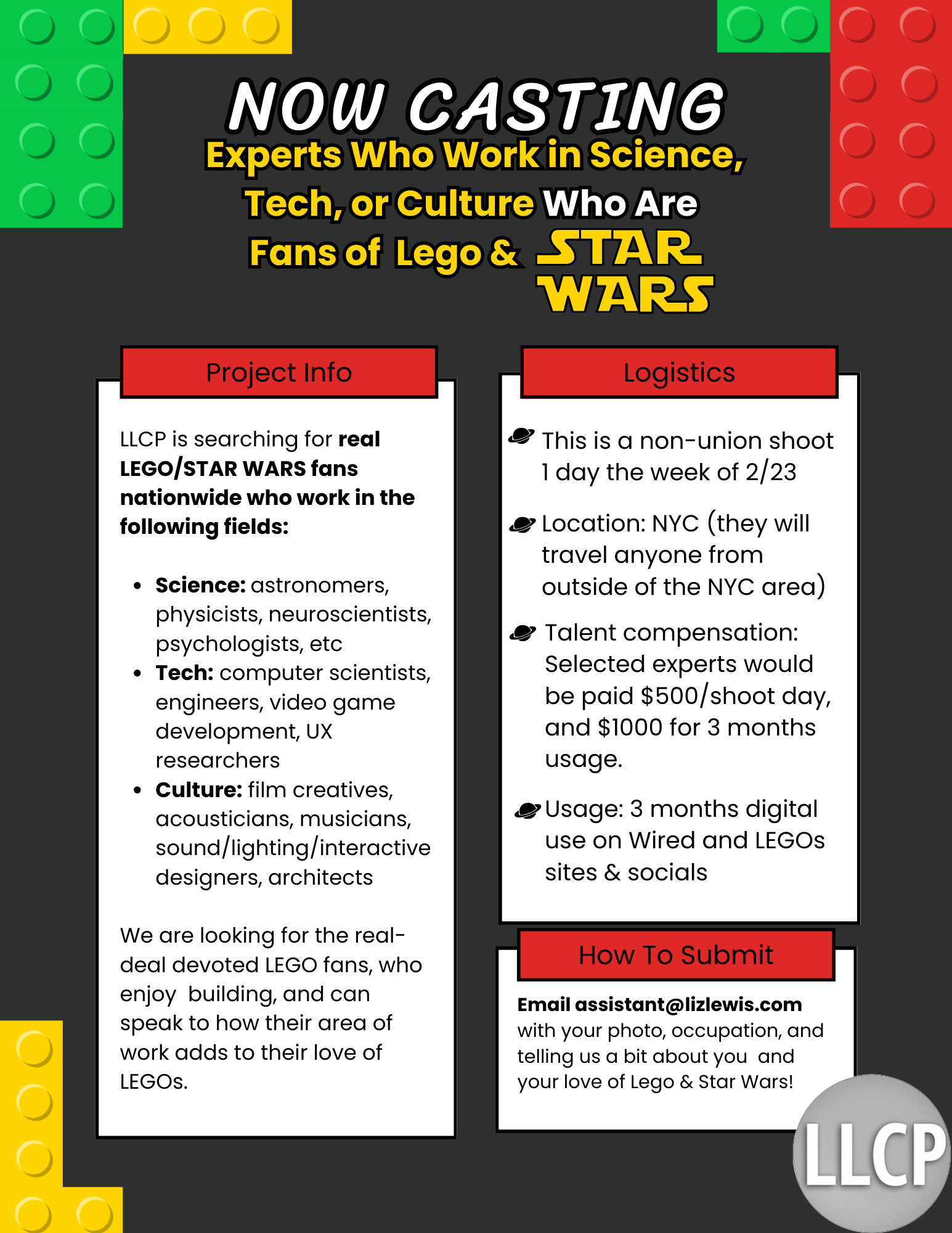 Adults: Nationwide search for fan of LEGO and STAR Wars who work in one of 3 areas: tech, science, and cultures. The professions listed are examples – we are open to all careers in these sectors. We are specifically looking for superfans who can speak to how their area of wok adds to their love of LEGOs, and would enjoy doing a build with one of our kid fans.